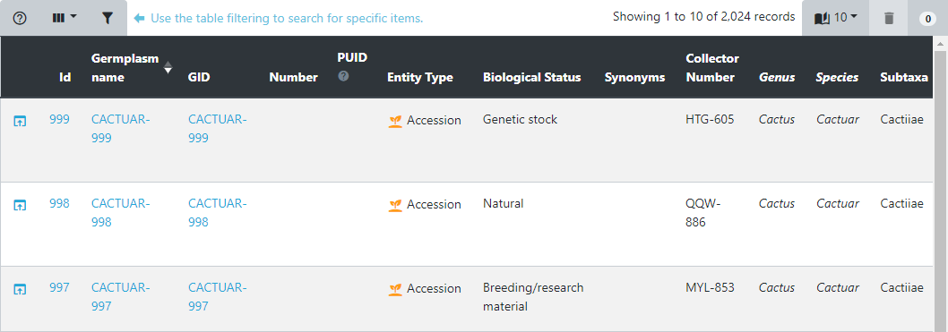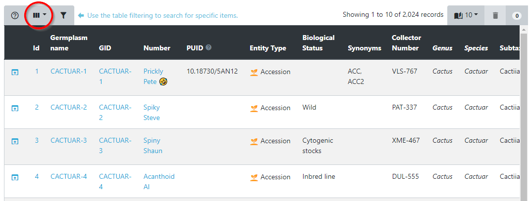 Filtering is a very useful tool when searching for specific data points. In this example, we are looking at the germplasm table. The filtering dialog is opened by clicking the filter button in the top left of the table.