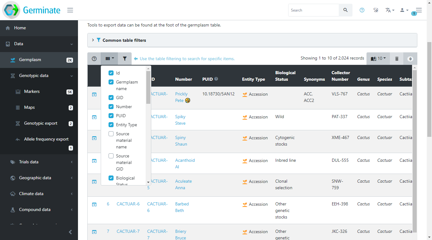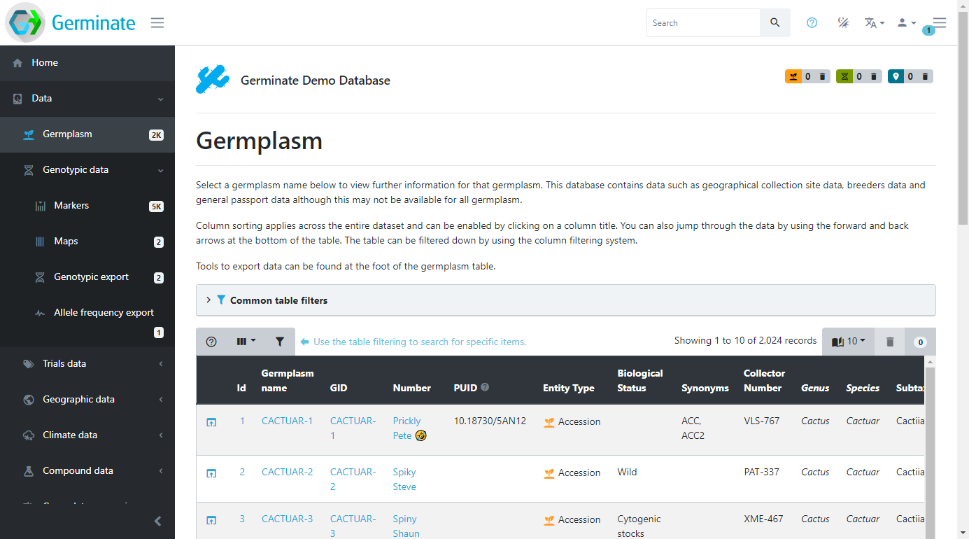 We will use the Germinate demo database in this instance (you should have it bookmarked but if not you can access it here). The demo database contains real data but we have anonymised it and assigned a fictional plant species, the Cactuar. We have done this because all projects are different and Germinate supports more data types than projects generally contain. The demo database has all data types we support along with all features available to users to try out in a safe environment.