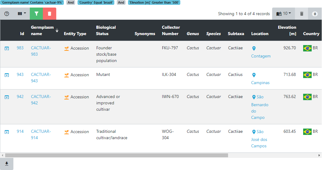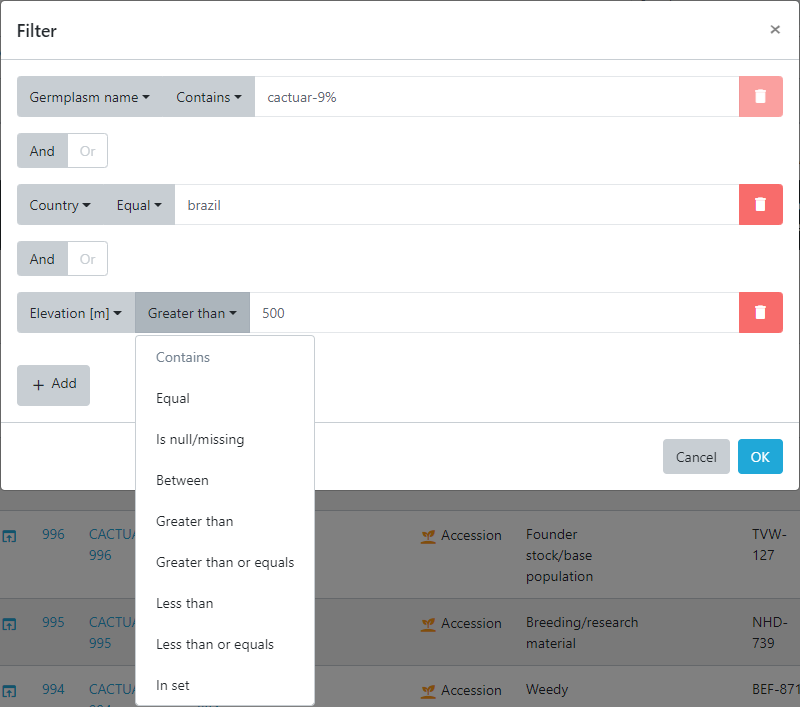 This filter can be combined with a search for germplasm from a specific country resulting in only germplasm with the combination of species and country of origin to be displayed in the resulting table. This example shows us building up a layered query by including only germplasm with the pattern cactuar-9% from Country that is equal to Brazil and finally only those matches where the collection site for the accession was greater than 500m.