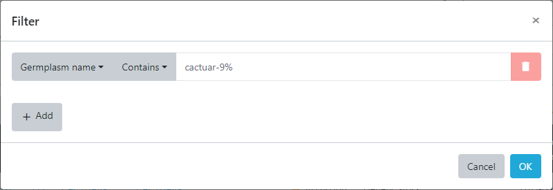 Here, search criteria for each column can be defined and combined allowing simple searches as well as complex queries. To search for germplasm whose name matches a specific text pattern select the Germplasm name column from the dropdown and then enter the text you want to search for. Be sure to change the match type from Equal to Contains then enter the following into the search box.