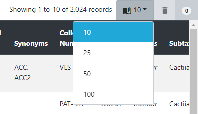 Another way to change how data is displayed in tables is changing the number of rows that are shown at a time. By default, Germinate only shows a small number of rows the reduce the amount of scrolling required to take in all the information. To show more rows per page, select a different value from the dropdown menu in the top right of the table. The display will refresh and now show the requested number of rows. Have a play about with this and see which looks best on your monitor screen. Like toggling table columns on or off this setting remains at the number you set until you close your browser.