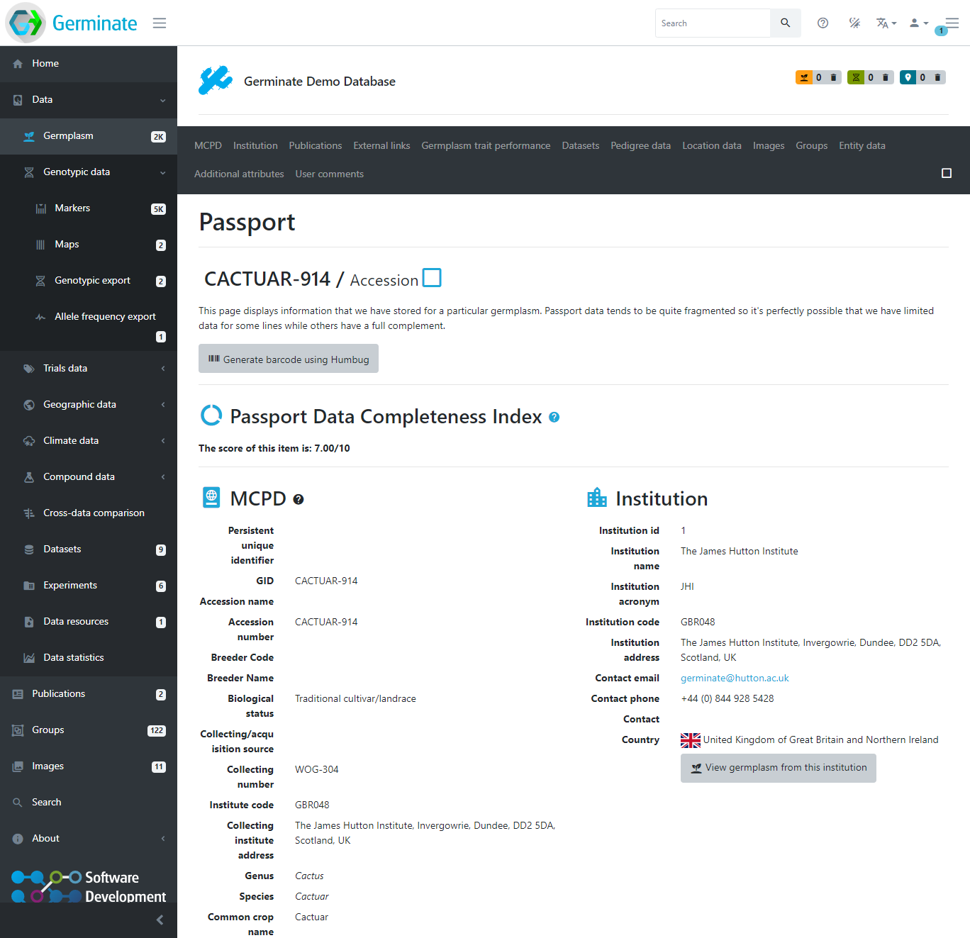 If we click on the Germplasm name we get a page that shows all the information we know about that particular entry. We will cover this in more detail later in this training but have a look and see what types of data Germinate holds for entry CACTUAR-914.