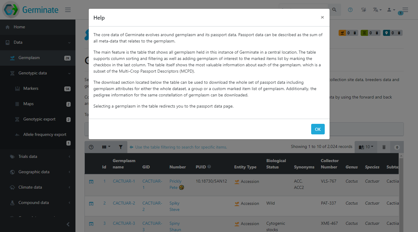 This help provides more information about the current page or functionality. This feature will explain the interface components or the content of the page in more detail. If they help icon is greyed out then additional help information is not available for this page. This screenshot shows the type of information that we hold for the germplasm page in Germinate.
